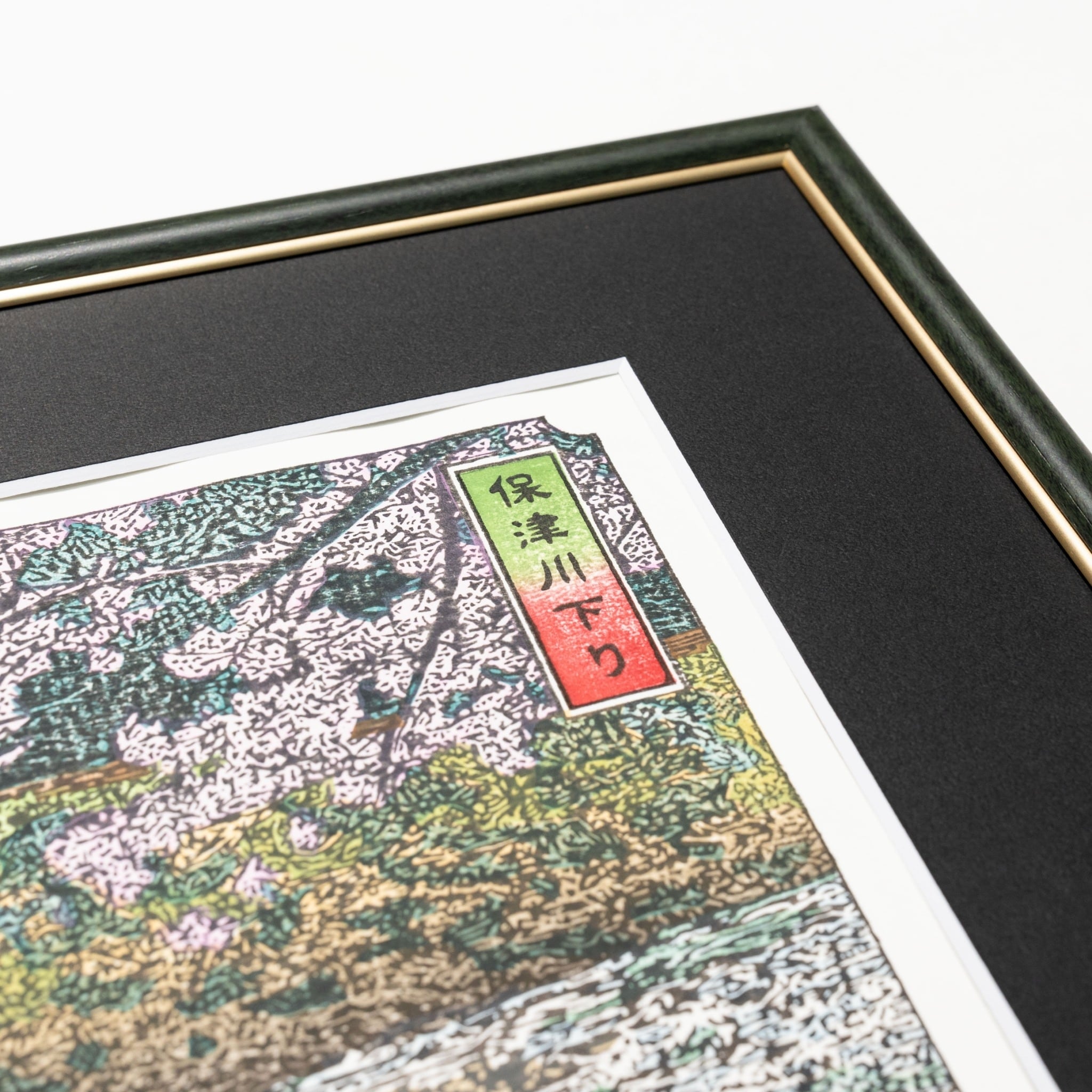 ・額縁の特徴=深緑が基調ですが、その両端にあしらわれた細い金がアクセントとなり、和洋問わず空間を彩ります。